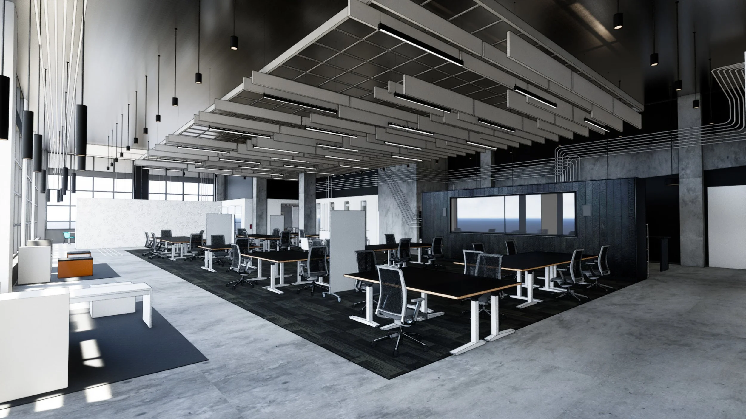 We started from the perspective of the people working in the space. We identified key values and the tone and vibe to give the space an identity. As a result, we delivered impressive features in the space while meeting practical use requirements as a flex space for project work, speaker presentations, and workshops.